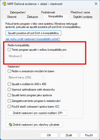 - Na záložce Kompatibilita zrušte zaškrtnutí v boxu Režim kompatibility